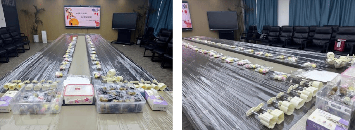 活动现场气氛热烈,欢声笑语不断。揉面、包馅、压模……每一个步骤都充满了乐趣与挑战。有的老师手法娴熟,做出的月饼饱满精致;有的老师虽是初次尝试,但在同事的帮助下也渐入佳境,现场互帮互助、交流心得的场景格外温馨。当一个个印有精美花纹、象征着团圆与美好的月饼在自己手中诞生时,大家的脸上都洋溢着自豪与喜悦的笑容。不一会儿,桌上就摆满了各式各样的月饼,现场弥漫着香甜的味道,节日的幸福感扑面而来。