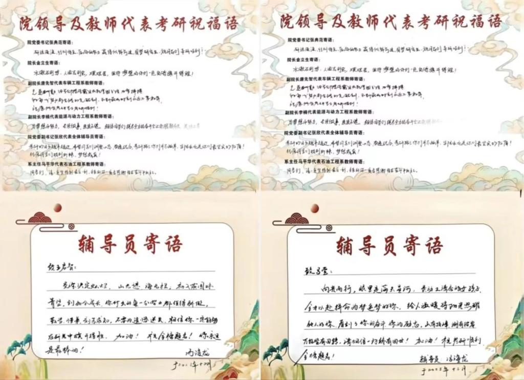 茶话会前,学院为228名报名研究生入学考试的2024届本科生准备了考研“加油”祝福卡,“加油”祝福卡是由院党委书记张典范、院长金立生、副院长唐先智、副院长李楠、院党委副书记张欣、石油工程系主任马平华、2020级辅导员冯海龙及2023级辅导员李洪庆手写的祝福寄语,为考研学子送去不一样的温暖和祝福。