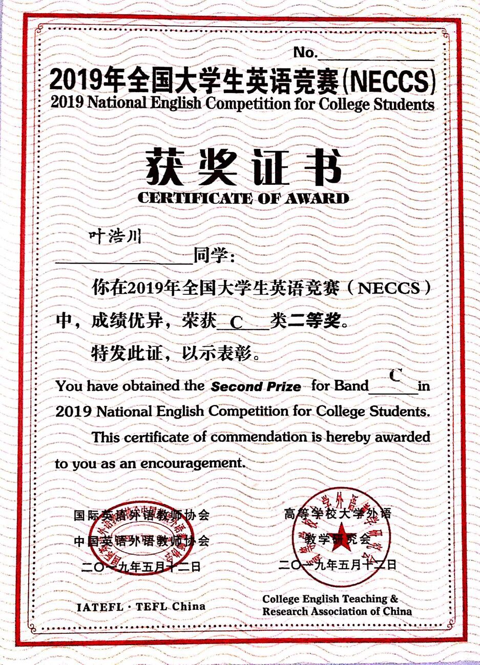 叶浩川在平日生活中学习勤奋刻苦,善于钻研,对待事情严谨,生活中注重学习时间的安排,每日除去上课时间学习时间不少于四个小时,在过去的三个学年中勤奋刻苦,基础知识以及专业知识扎实,成绩名列前茅,除此之外,在学科竞赛方面有自己的建树,在个人学习方面树立了榜样。