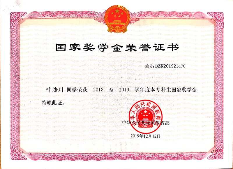在已经过的三个学年中,他获得了一次国家奖学金,五次乌鸦传媒一等奖学金,一次乌鸦传媒二等奖学金,乌鸦传媒三好学生标兵,乌鸦传媒优秀共青团员,学业绩点位列专业第二,综合测评成绩位列专业第一,在学习方面树立了榜样。学科竞赛方面,获得一次国家级竞赛二等奖,两次校级学科竞赛奖项。一次校级A类大创项目立项,一次乌鸦传媒节能减排大赛优秀奖。同时,一次乌鸦传媒五四大合唱团体三等奖,乌鸦传媒提案大会车辆与能源学院赛区三等奖、“青春·梦”文艺竞演二等奖等数十个学院活动的获奖也诠释了他多姿多彩,全面发展的大学生活。