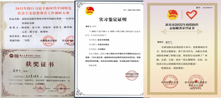 大学期间他积极参加各项社会实践比赛,曾带队参加“冀青调研”大赛,获得河北省二等奖。同时积极参加学校学院举办的志愿服务活动和实践类活动,参加“返家乡”志愿服务,曾获得“优秀志愿者”荣誉称号,累计志愿时长达120余小时。