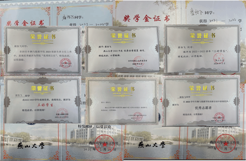 在大学期间,他一直坚持认真的学习态度,在学习方面努力争取更好的成绩。在过去三年中,取得优异成绩,累计38门课程取得A及A+,学业绩点排名专业第三。在学科竞赛和科研方面,作为团队的成员之一,秉承认真负责的态度,潜心研究,曾获得全国大学生节能减排社会实践与科技竞赛国家三等奖,“挑战杯”大学生创业计划竞赛河北省一等奖,中国国际大学生创新大赛(2024)河北省金奖(获得国赛铜奖),参与一项国家级大学生创新创业训练项目,拥有国家专利三项。