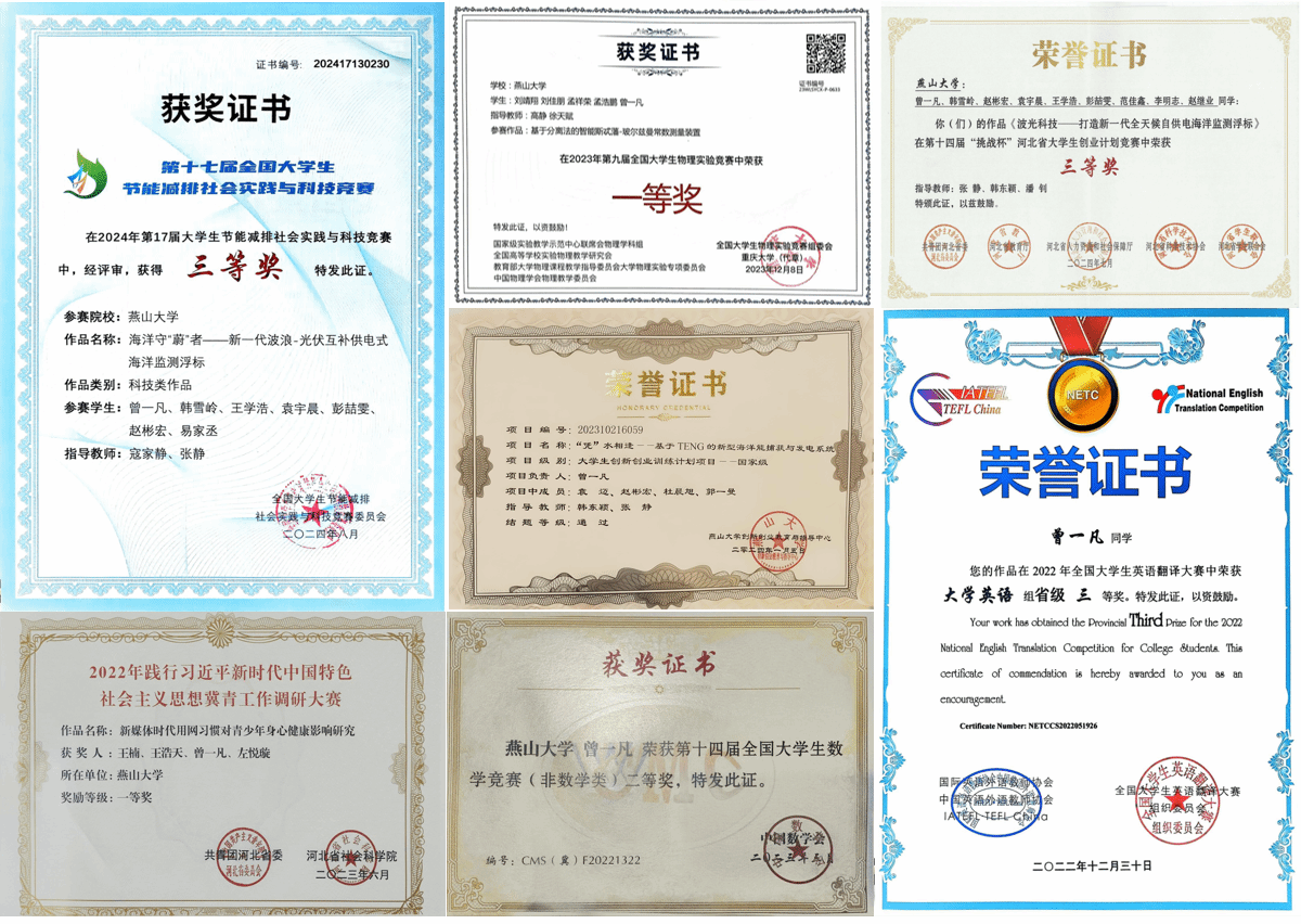 在学科竞赛方面,我获得过国家级奖项五项、省级奖项九项、校级奖项三十余项,其中包括全国大学生物理实验竞赛一等奖、全国大学生节能减排社会实践与科技竞赛三等奖等。参与这些学科竞赛,不仅让我在实践中检验了所学的理论知识,也让我学会了如何在压力下保持冷静,如何与团队成员有效沟通,如何不断优化解决问题的方法。