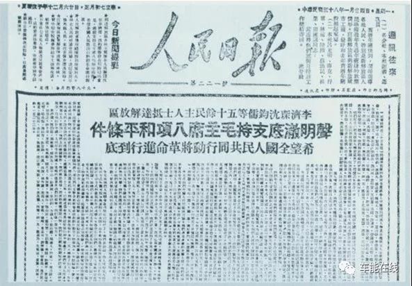 1949年1月22日 李济深、沈钧儒等55人联名发表对时局的声明,拥护毛泽东提出的八项和平条件。