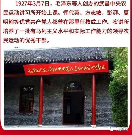 1927年3月7日,毛泽东在董必武等支持和帮助下,创办了武昌中央农民运动讲习所。