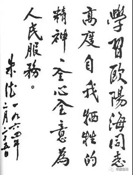 1964年3月19日,新华社发表朱德、董必武、贺龙、聂荣臻、徐向前、叶剑英、罗瑞卿的题词,号召全军向伟大的共产主义战士欧阳海学习。国防部命名他生前所在班为“欧阳海班”。欧阳海是中国人民解放军某部班长。1963年11月8日,随军野营训练,路过京广铁路时,炮连一匹马受火车鸣笛惊恐,突然跨上铁路,在火车与马即将相撞的危急时刻,欧阳海奋不顾身将马推出铁路,避免了列车出轨,保障了旅客安全,自己负重伤,壮烈牺牲。